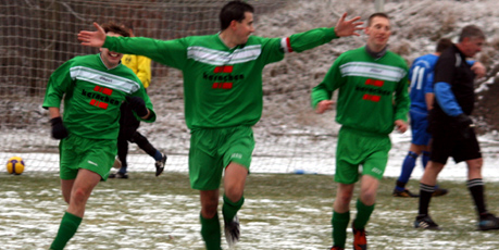 oben: 88.min A.Luetjens (mitte) schiesst den "RSV" mit seinem Elfmetertor zum Sieg! Der Jubel kennt keine Grenzen! .......... (li. "Matze Weigt und re. "Matze" Kleineidam) mitte: A.Roth (li.) und "Speck" D.Sponholz (re.) in Aktion ......! unten: Und weil es so schön ist zu jubeln, gönnen wir Patrick Donat (ganz links) dieses Bild! Erst Libero, dann nach vorne beordert erzielt er den Ausgleich und bringt uns damit auf die Siegerstrasse! Eindeutig "Man of the Day"! |